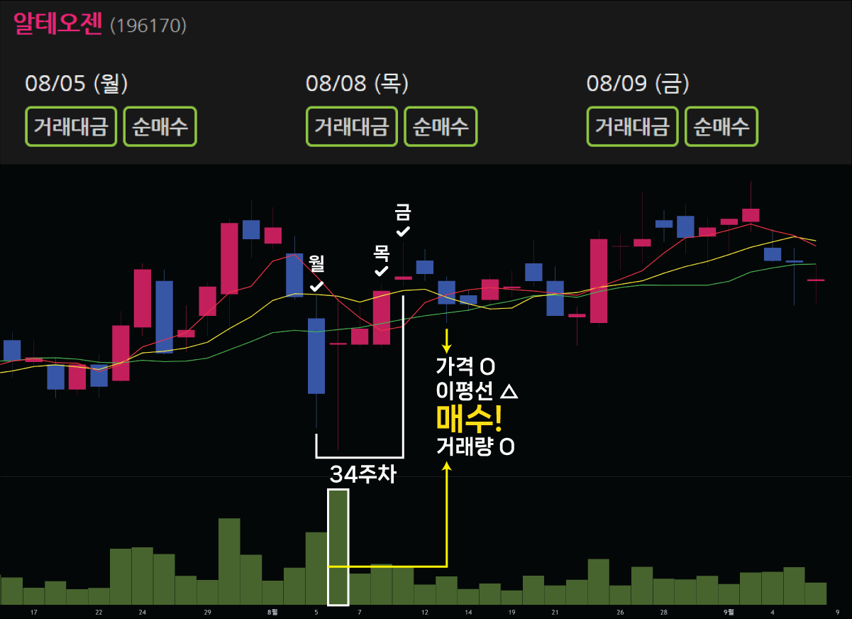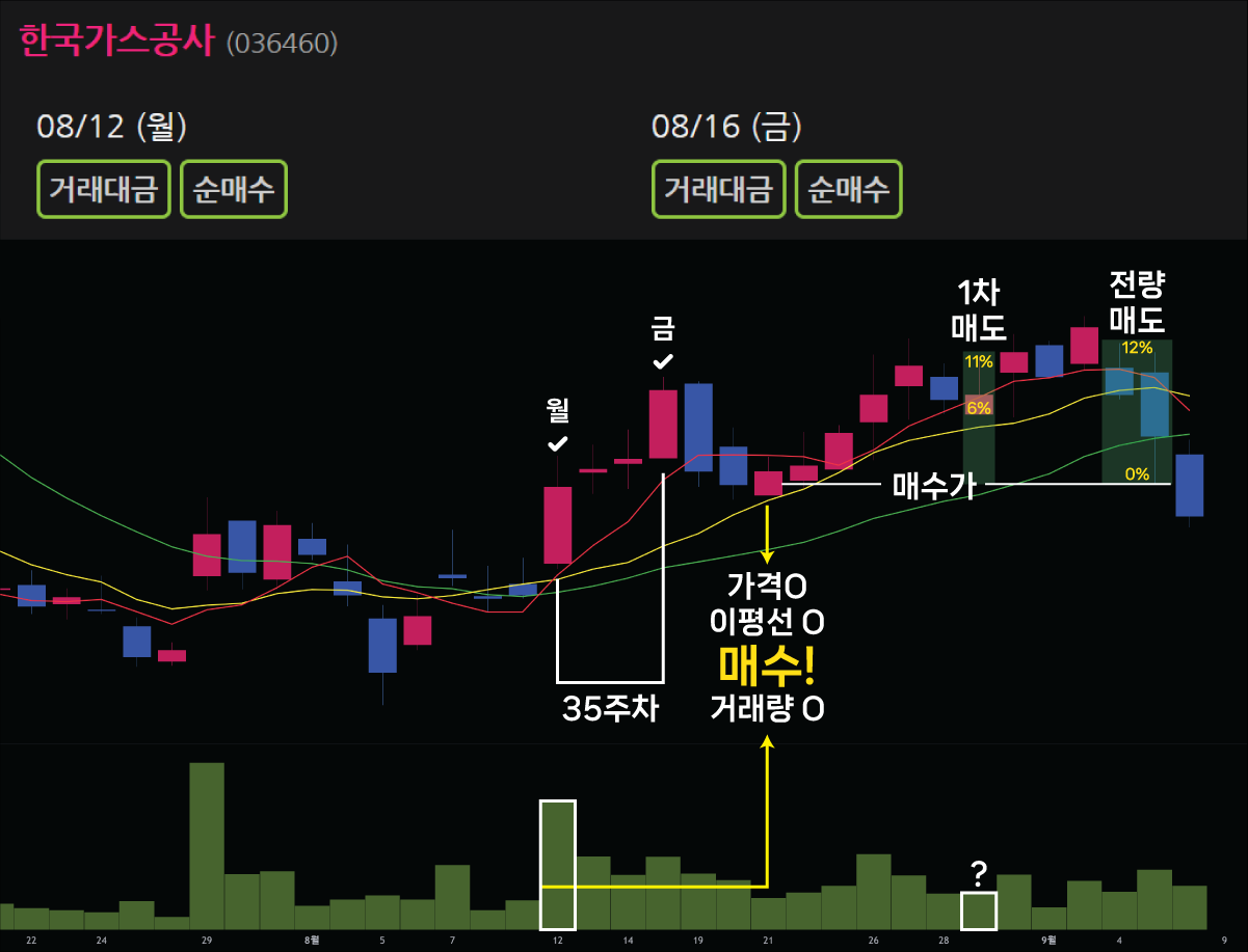 다른 예시를 보겠습니다. 2024년 35주차 월요일과 금요일 데일리인덱스에 나타난 한국가스공사입니다. 목요일이 광복절이므로 일주일이 4일이었습니다. 해당 주에서 월요일이 가장 큰 거래량을 보였습니다. 36주차 점차 거래량이 줄어서 수요일에 거래량 조건을 만족했습니다. 가격도 5일선 아래, 10일선 위에 있습니다. 이동평균선 역시 정배열입니다. 모든 조건이 만족하므로 매수할 수 있습니다.