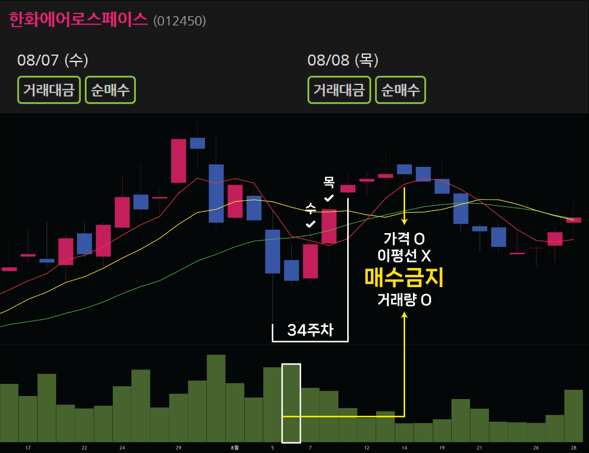 다음은 매수하지 않는 예를 보겠습니다. 34주차 위클리인덱스에 나타난 한화에어로스페이스입니다. 35주차 월요일 바로 거래량 조건이 만족하지만, 가격이 5일 이동평균선보다 5%이상 갭이 있습니다. 화요일은 거래량이 만족하지 않습니다. 수요일, 거래량도 가격도 만족합니다. 하지만 10일 이동평균선이 20일 이동평균선을 깨고 내려왔습니다. 때문에 매수하지 않습니다.