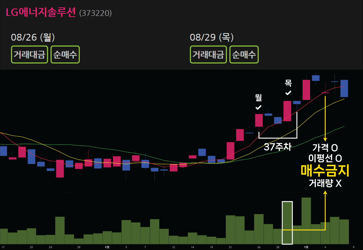 LG에너지솔루션은 37주차 위클리인덱스에 나타났습니다. 해당 주의 목요일이 가장 큰 거래량을 보였습니다. 하지만 38주차에 1/3 이하의 거래량을 형성하지 못했습니다. 가격과 이동평균선 모두 만족하지만 거래량 조건을 만족하지 않으므로 매수하지 않습니다.