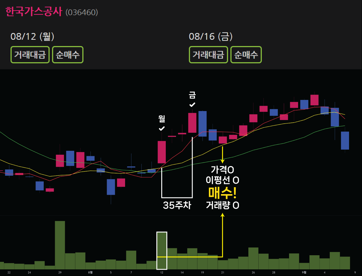 다른 예시를 보겠습니다. 2024년 35주차 월요일과 금요일 데일리인덱스에 나타난 한국가스공사입니다. 목요일이 광복절이므로 일주일이 4일이었습니다. 해당 주에서 월요일이 가장 큰 거래량을 보였습니다. 36주차 점차 거래량이 줄어서 수요일에 거래량 조건을 만족했습니다. 가격도 5일선 아래, 10일선 위에 있습니다. 이동평균선 역시 정배열입니다. 모든 조건이 만족하므로 매수할 수 있습니다.