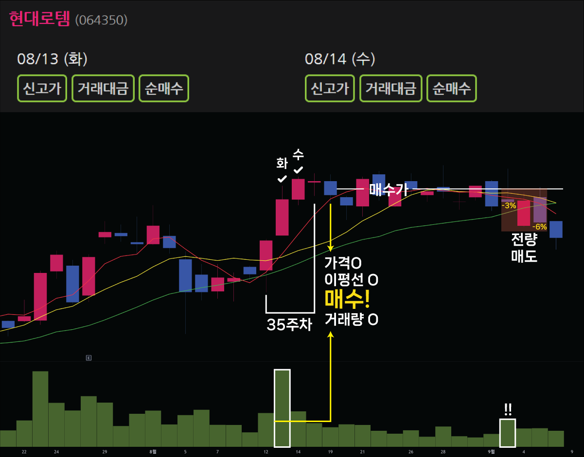 다음은 매수하지 않는 예를 보겠습니다. 34주차 위클리인덱스에 나타난 한화에어로스페이스입니다. 35주차 월요일 바로 거래량 조건이 만족하지만, 가격이 5일 이동평균선보다 5%이상 갭이 있습니다. 화요일은 거래량이 만족하지 않습니다. 수요일, 거래량도 가격도 만족합니다. 하지만 10일 이동평균선이 20일 이동평균선을 깨고 내려왔습니다. 때문에 매수하지 않습니다.