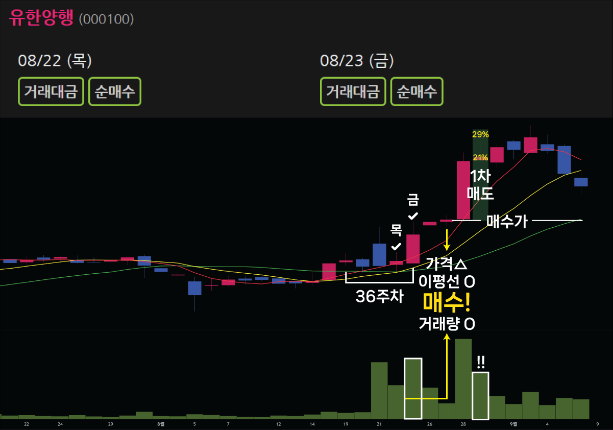 다음은 유한양행의 예를 보겠습니다. 2024년 8월 27일에 매수 조건에 따라 해당 종목을 매수했다면, 다음 날 급등 이후, 29일에 긴 윗꼬리 양봉이 출현합니다. 이 때, 거래량이 상당히 높습니다. 따라서 반드시 절반을 매도합니다. 시점에 따라서 21% ~ 29%의 수익이 발생합니다. 나머지 절반은 보유하면서, 본절을 위협하는 장대음봉이나 하락을 암시하는 거래량 많은 유성형 캔들이 출현하면 정리할 수 있겠습니다.
